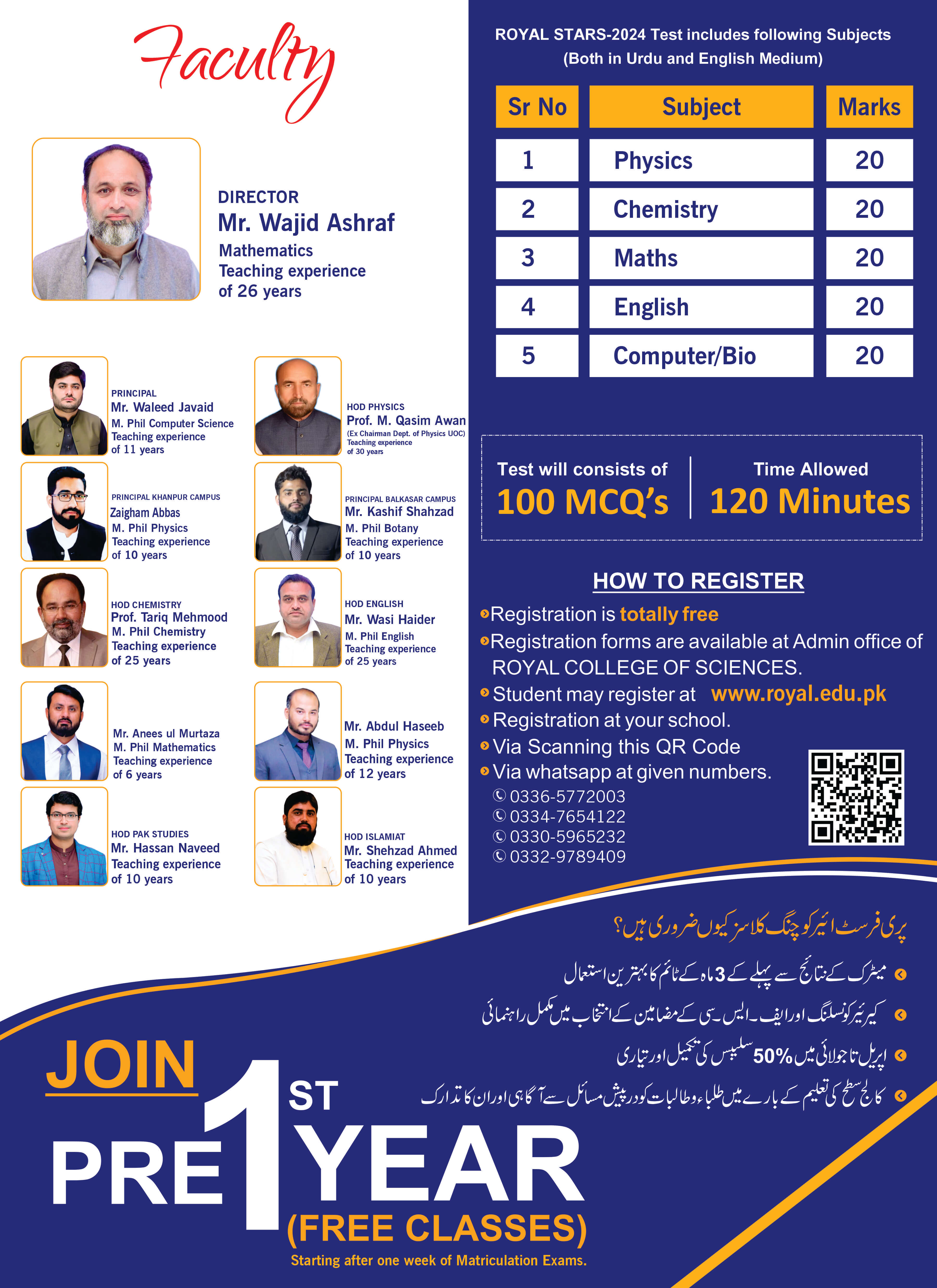 Royal College of Sciences, a beautiful galaxy of highly skilled and trained national/international teachers, has established its educational atmosphere with modern techniques. We will shape future of our students in a royal way. New era is a period of emerging sciences coupled with information technology and asks for ultra modern skills. We have a royal solution to modern education furnishing modern changes in the latest ways.